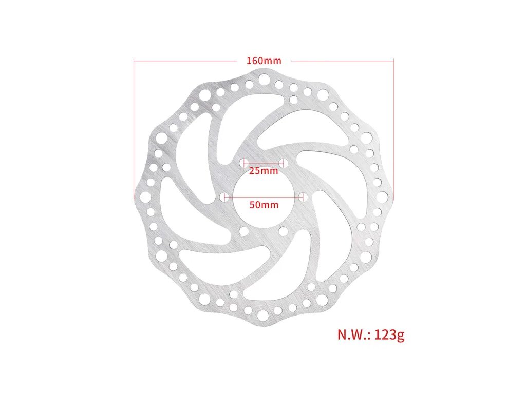 Brzdový kotúč s priemerom 160 mm a 6-dierovým uchytením s diagonálnou roztečou 44 mm. Určený pre kotúčové brzdy bicyklov a elektrických kolobežiek, poskytuje spoľahlivý a...
