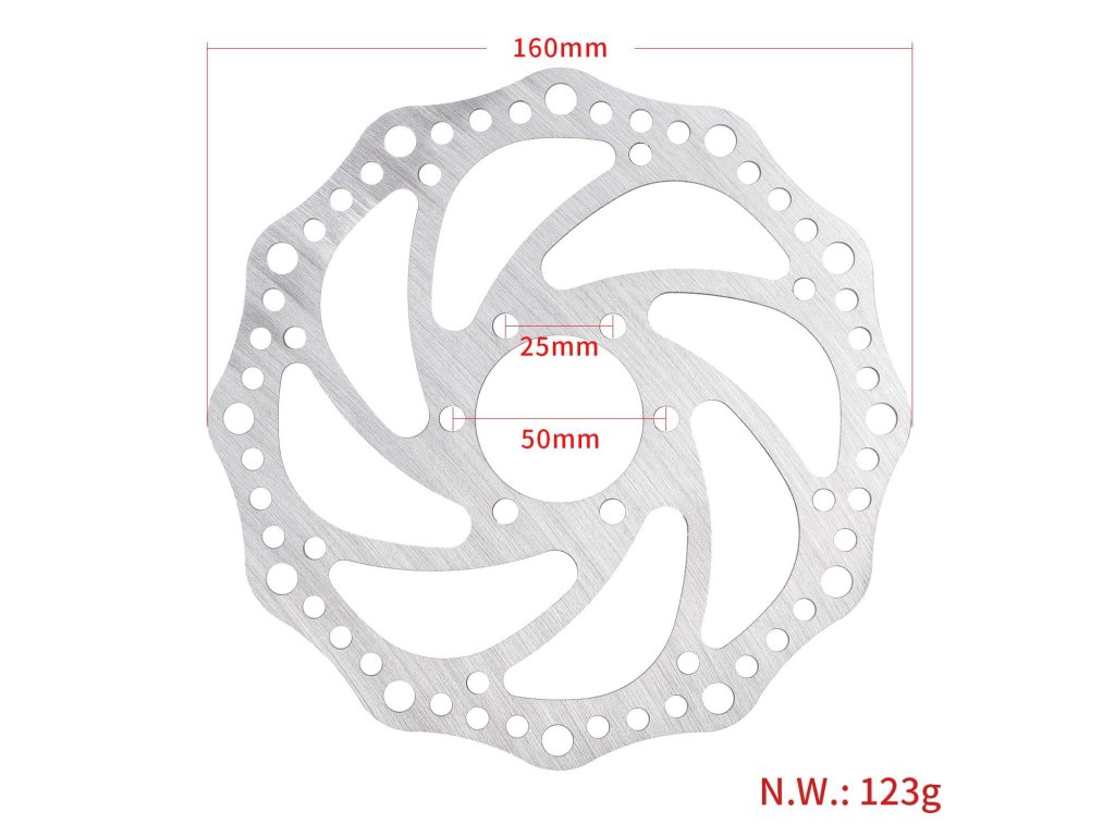 Brzdový kotúč s priemerom 160 mm a 6-dierovým uchytením s diagonálnou roztečou 44 mm. Určený pre kotúčové brzdy bicyklov a elektrických kolobežiek, poskytuje spoľahlivý a...