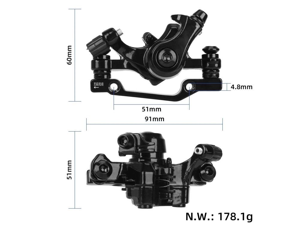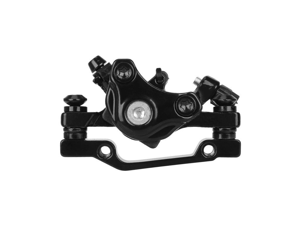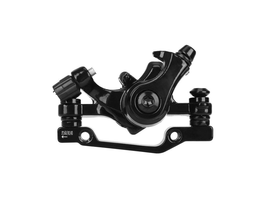 Samostatný zadný brzdový strmeň pre kotúčové brzdy s priemerom 180 mm. Určený ako náhradný diel pre bicykle a elektrické kolobežky.
