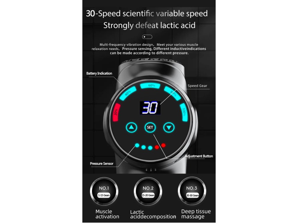 - Masážnu pištoľ uvediete do prevádzky stlačením prostredného červeného tlačidla na LCD displeji.