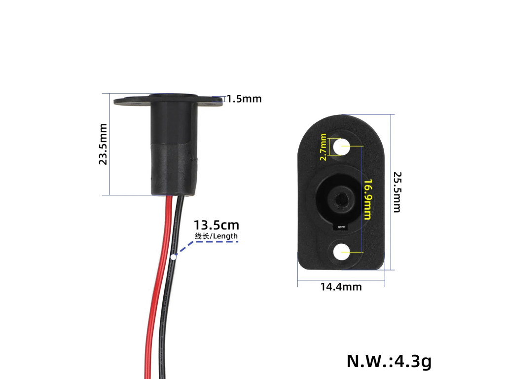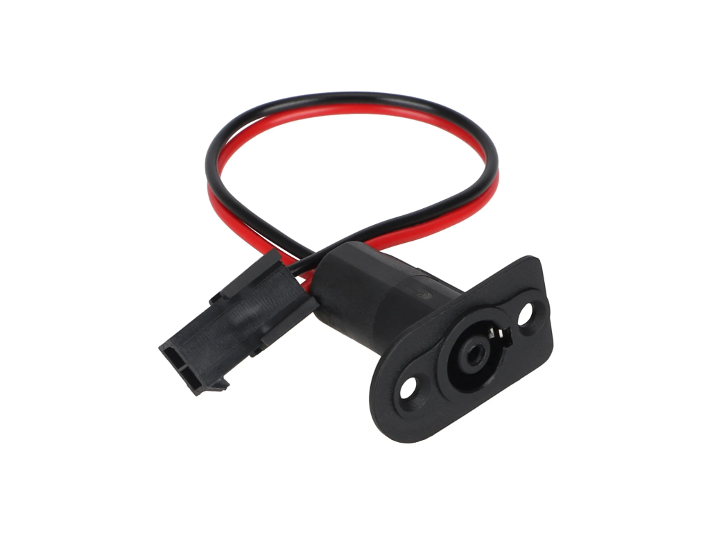 Náhradný nabíjací konektor DC 5.5 × 2.1 mm určený pre elektrické kolobežky a e-biky. Slúži ako panelový konektor pre pripojenie nabíjačky k batérii vozidla.