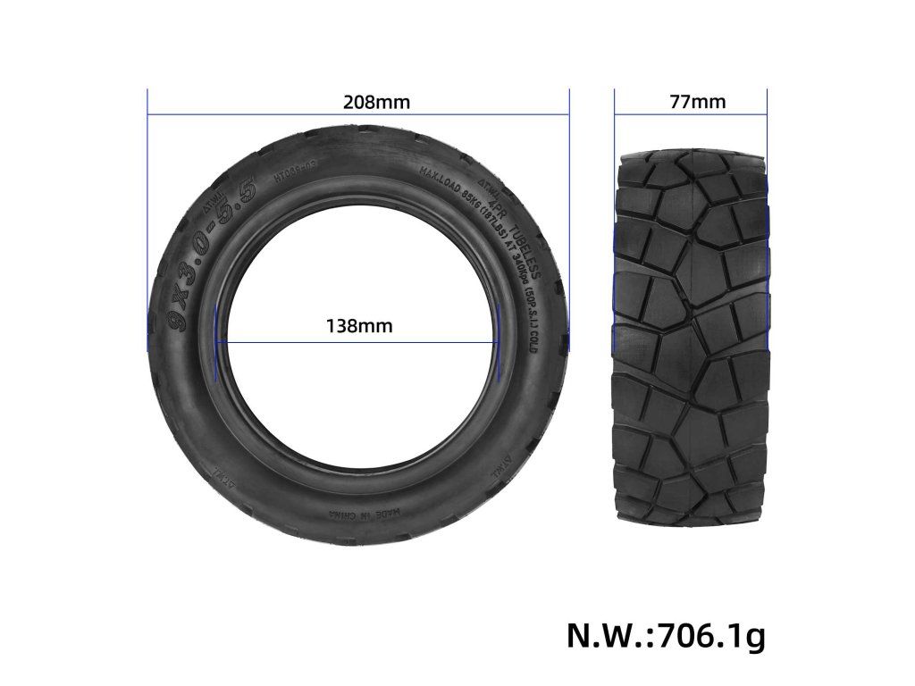 Pneumatika je kompatibilná s elektrickými kolobežkami vybavenými 9-palcovými ráfikmi s rozmerom 9x3.0 5.5. Ideálna ako náhrada opotrebovaných alebo poškodených pneumatík.
