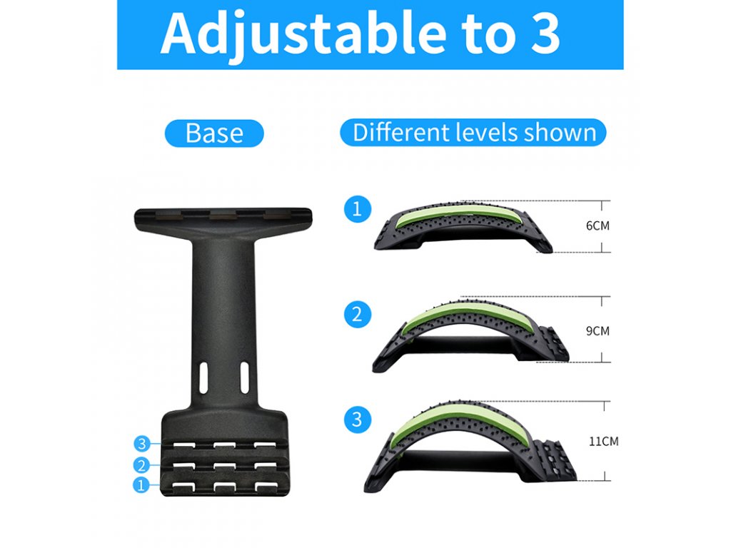 Naša strečingová podložka na chrbát má tri nastaviteľné úrovne. Je vhodná pre jednotlivcov rôzneho veku! Čím vyššie sa podložka nastaví, tým viac si natiahnete chrbát. Nastavte podložku na chrbticu na pre vás najpohodlnejšiu úroveň.