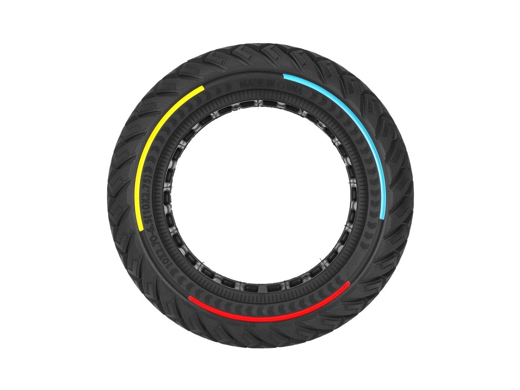 Trojfarebné kruhy na bočnici dodávajú kolobežke výrazný a športový vzhľad, vďaka čomu pneumatika plní aj estetickú funkciu.
