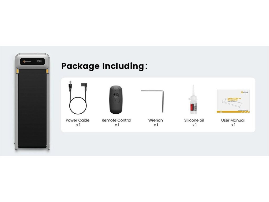 Hodinový bežecký pás pod stolomUREVO má hrúbku iba 11 cm a hmotnosť 24,1 kg. Je navrhnutý s dvoma prednými pojazdnými kolieskami, takže ho môže každý ľahko premiestňovať. Na zabezpečenie lepšieho zážitku nie je potrebné bežecký pás inštalovať a možno ho používať priamo po rozložení.