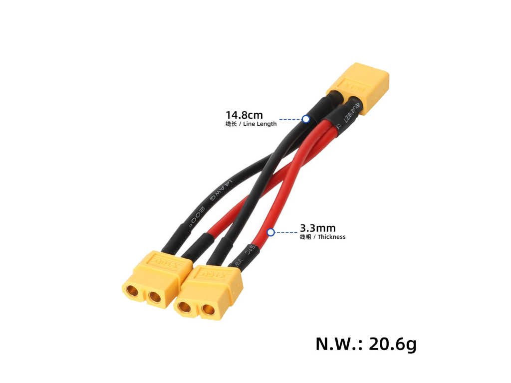 Paralelný napájací kábel XT60 umožňujúci rozdelenie jedného vstupu na dva výstupy. Ideálny pre Li-ion batérie, elektrické kolobežky, e-bicykle a RC zariadenia.