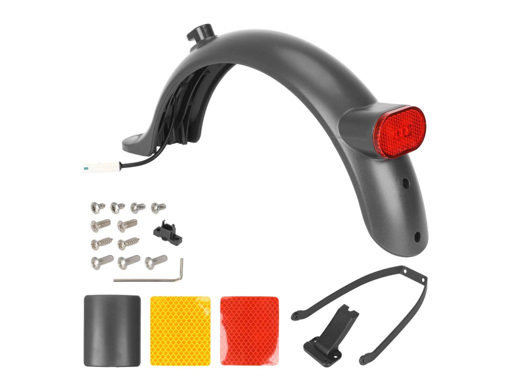 Kompletný zadný blatník v sivom prevedení s integrovaným zadným LED svetlom, držiakom ŠPZ a hákom na zaistenie kolobežky po zložení. Určený pre modely Xiaomi M365, 1S, Pro, Pro2...